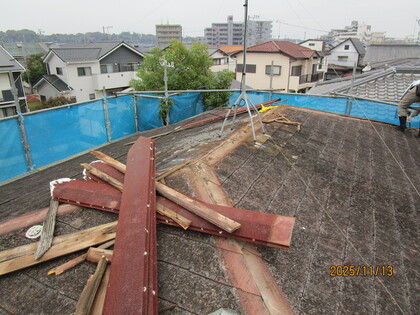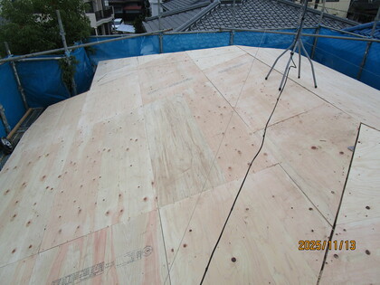 既存の屋根の上に合板を張りました。屋根が頑丈になり、屋根の仕上げ材