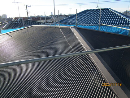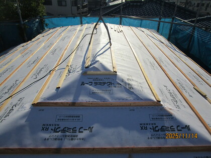 屋根防水シート張・胴縁下地張状況