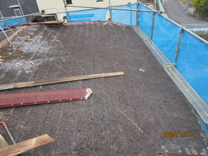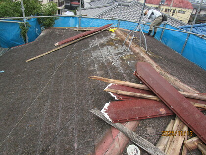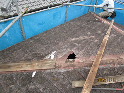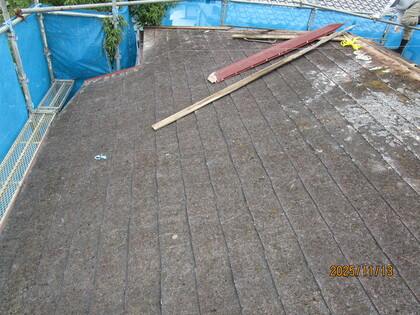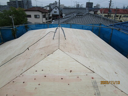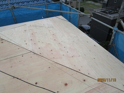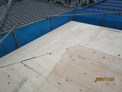 既存の屋根の上に合板を張りました。屋根が頑丈になり、屋根の仕上げ材