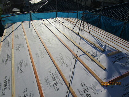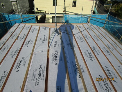 屋根防水シート張・胴縁下地張状況