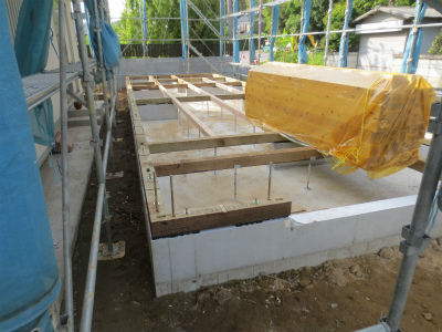 いよいよ建前の準備です。写真は、基礎に土台を敷き終わった