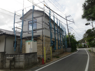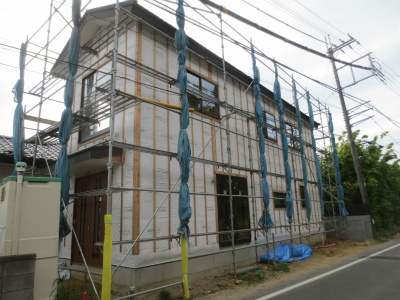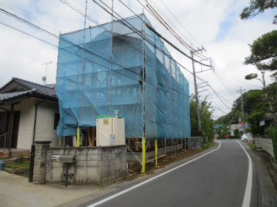 建前が終わり、足場には、シート貼った状況です。外観は、