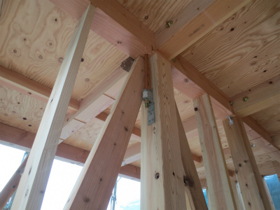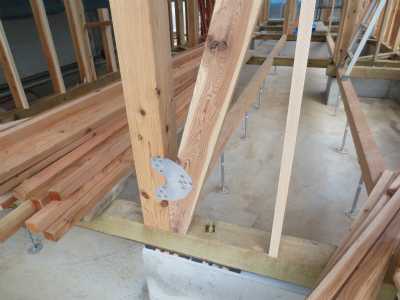 筋違金物の取付状況です。筋違、金物もすべて取付終り、