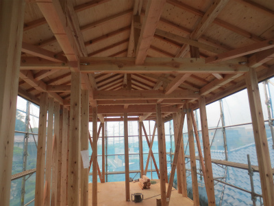 筋違と間柱がつき、サッシも取付しました。