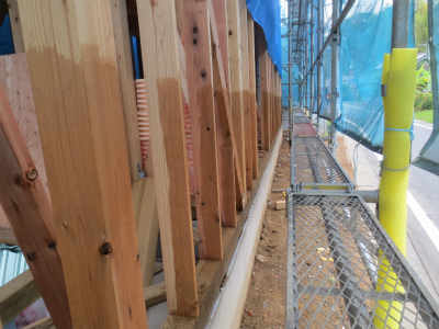 防腐剤塗布状況です。土台から1mくらいまで、柱、間柱、