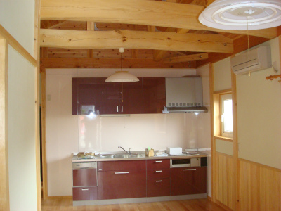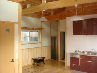 リビングダイニング及び奥がキッチンです。床は檜のフローリング、壁は、腰壁は檜の羽目板とその上がケイソウド仕上げとなっています。自然素材を多く使用しました。