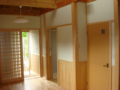 玄関から入って居室になりますが、床のフローリングは、サクラを使用し、壁は、檜の腰板と珪藻土となっています。また、柱をみせる真壁とし、梁もみせるようにしました。
