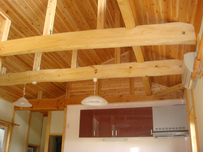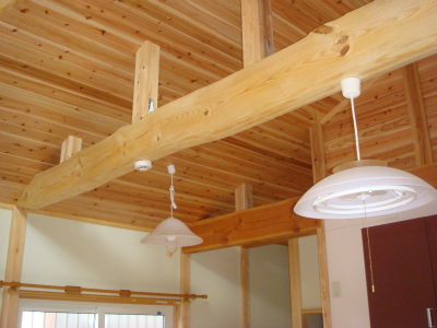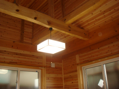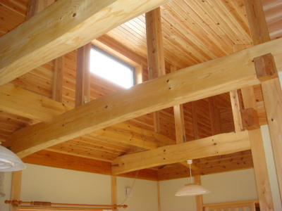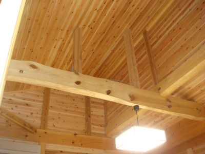 天井は大きな吹き抜け空間となっています。窓を一部設けて光が差し込んで部屋全体を明るくしています。太鼓梁を表し、壁・天井は杉の羽目板を全体に張っています。