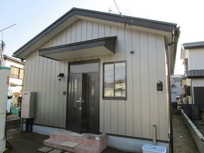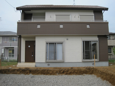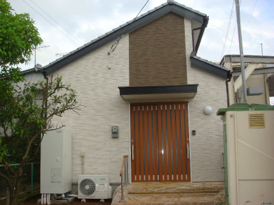 敷地の幅が縦長のため、屋根の形は工夫をして、このような形となりました。玄関の上部の壁は、アクセントとして色を変えてみました。
