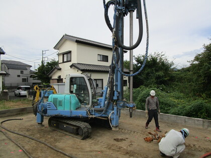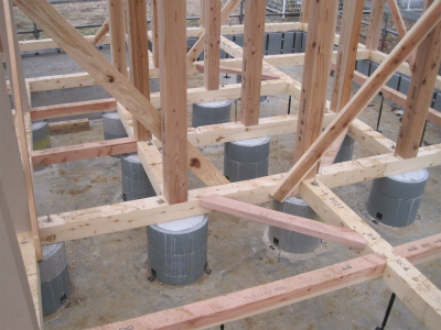 柱の下の丸い基礎は、エアサイクル専用のコラムキソといいます。柱のしたのみ設置することにより、基礎下の空気の流れが良くなり、湿気がたまりにくくなります。