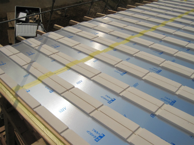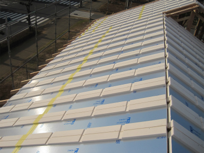 エアサイクル専用の屋根断熱材です。表面のアルミ拍は、日射熱を反射し、小屋裏温度を抑制します。また、30mmのくぼみが通気層となり、棟換気で小屋裏の空気を排熱します。
