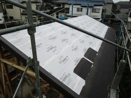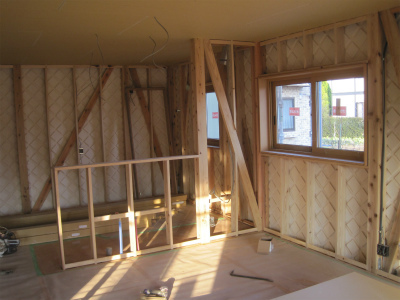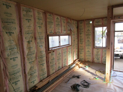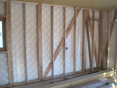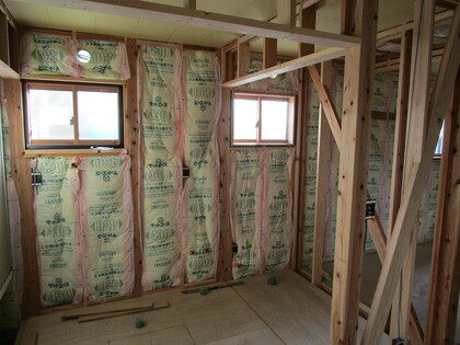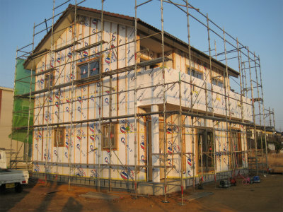 外壁サイディングを張る前の外観です。基礎も壁もエアサイクルの断熱材が施工されています。