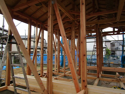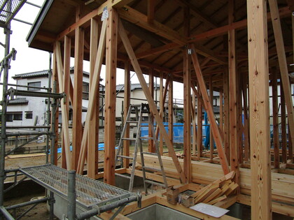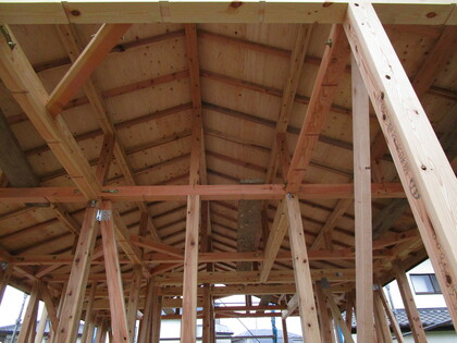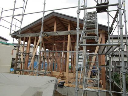 建前が終了しました。平屋の大きな切妻屋根の躯体が姿を現しました。