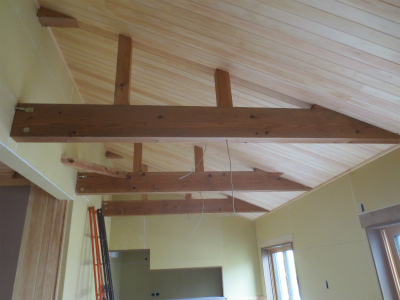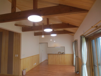 リビングになります。床はサクラのフローリング、壁は檜の腰壁、天井は勾配天井として梁をあらわしました。勾配部分には、檜の羽目板を張りました。空間も広いですが、天井も高いので、非常に解放感のある空間となりました。