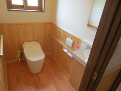 トイレになります。便器は、シンプルにタンクなしのパナソニックのアラウーノです。自動水洗や節水機能もあり、非常に優れた便器です。