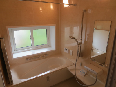 ユニットバスとなります。1.25坪タイプとし、通常よくある1坪タイプより、広めになります。また、30cmの出窓とし、窓の奥行をつくりました。