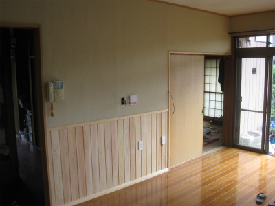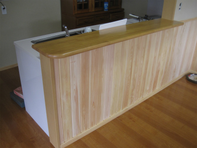 檜の無節の腰壁は、近くでみても非常にきれいで、木のぬくもりを感じる事ができます。仕上げに、自然塗料を塗って、汚れにくく、少し色合いが濃くなりました。