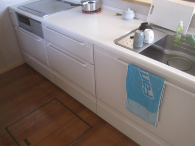 タカラスタンダード製のキッチンになります。IHクッキングヒーターのコンロとし、たっぷりの収納スペースを設けました。タカラのキッチンは材質がホーローといって非常に耐久性があり、壊れにくいのが特徴になります。