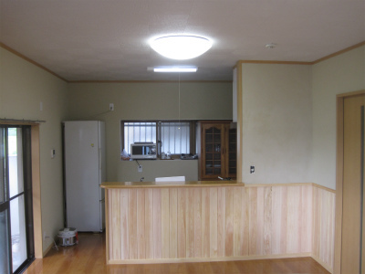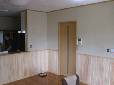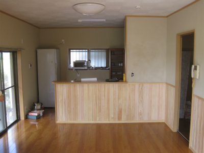 壁を檜の腰板とし、壁は左官仕上げとしました。奥がキッチンになります。