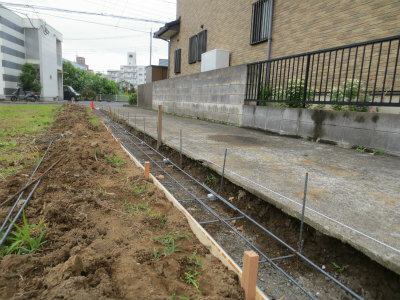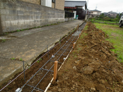 まずは、ブロックの基礎となるベースからの工事です。配筋をし、